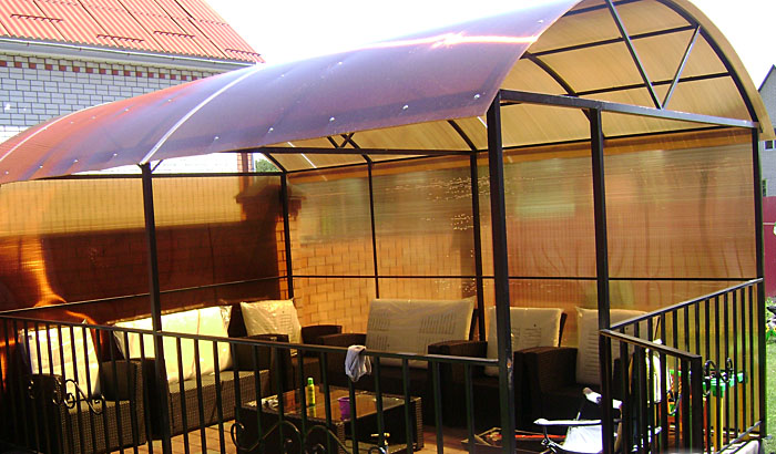 Даже если поликарбонат разбить, он не дает осколков, как стекло пожаробезопасность – поликарбонат трудновоспламеняем, он не горит, плавление начинается при достижении температуры в +125С. Красивые беседки из поликарбоната имеют ряд преимуществ: использование поликарбоната для остекления стен и в качестве перекрытия визуально разрушает границы между беседкой и окружающим пространством, что позволяет человеку чувствовать себя ближе к природе. А светопроницаемая крыша с поликарбонатом с оранжевым или желтоватым оттенком создаст иллюзию солнечных лучей даже в пасмурный день.
